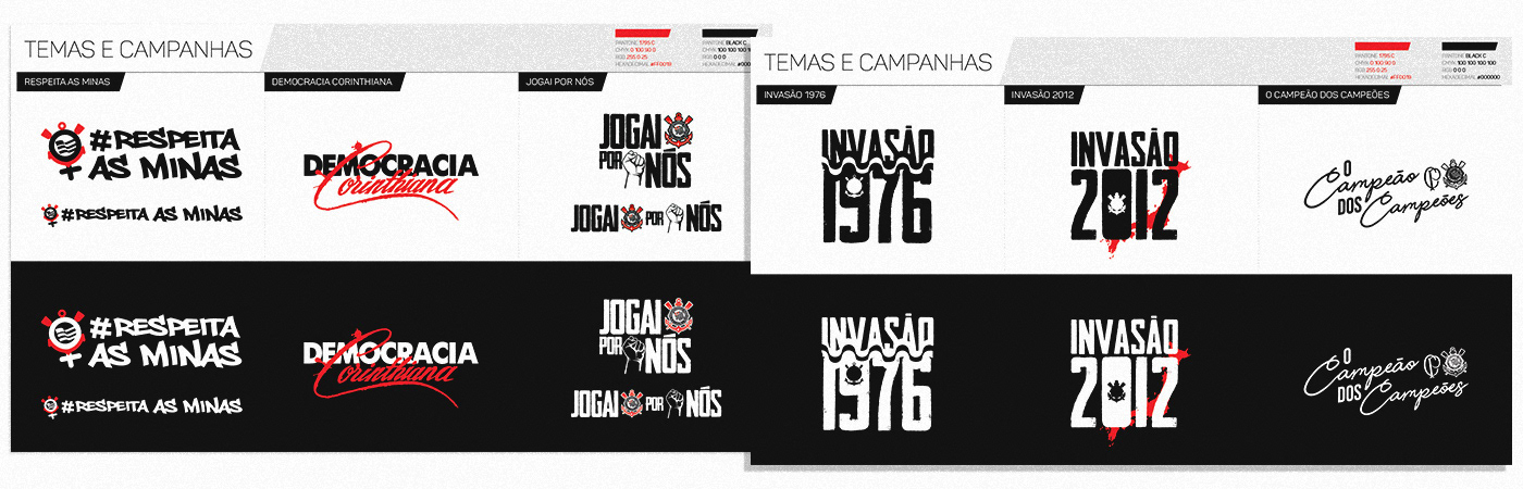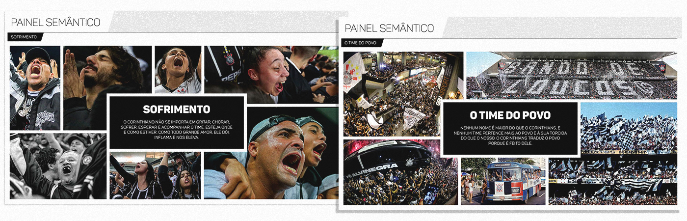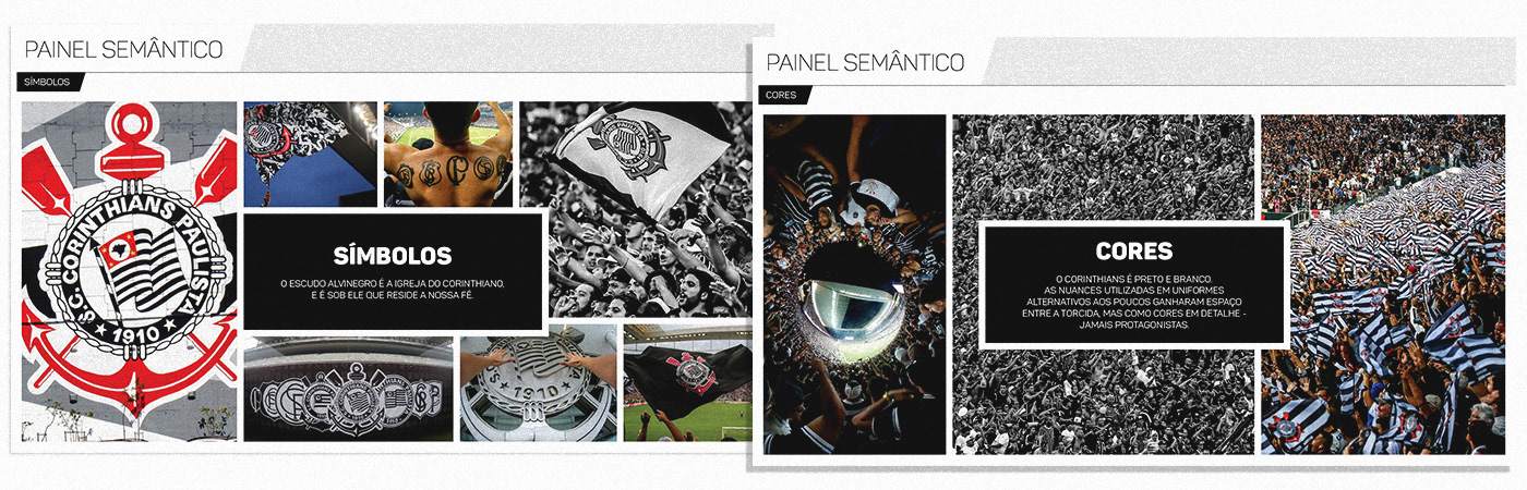 [EN] It includes traditional elements (such as brand construction and usage, applications, variations, color palette, typographic families, do's and don'ts, patterns, and textures), as well as specific aspects of Corinthians, utilizing a semantic panel to quickly understand what sets Corinthians fans and consumers apart.